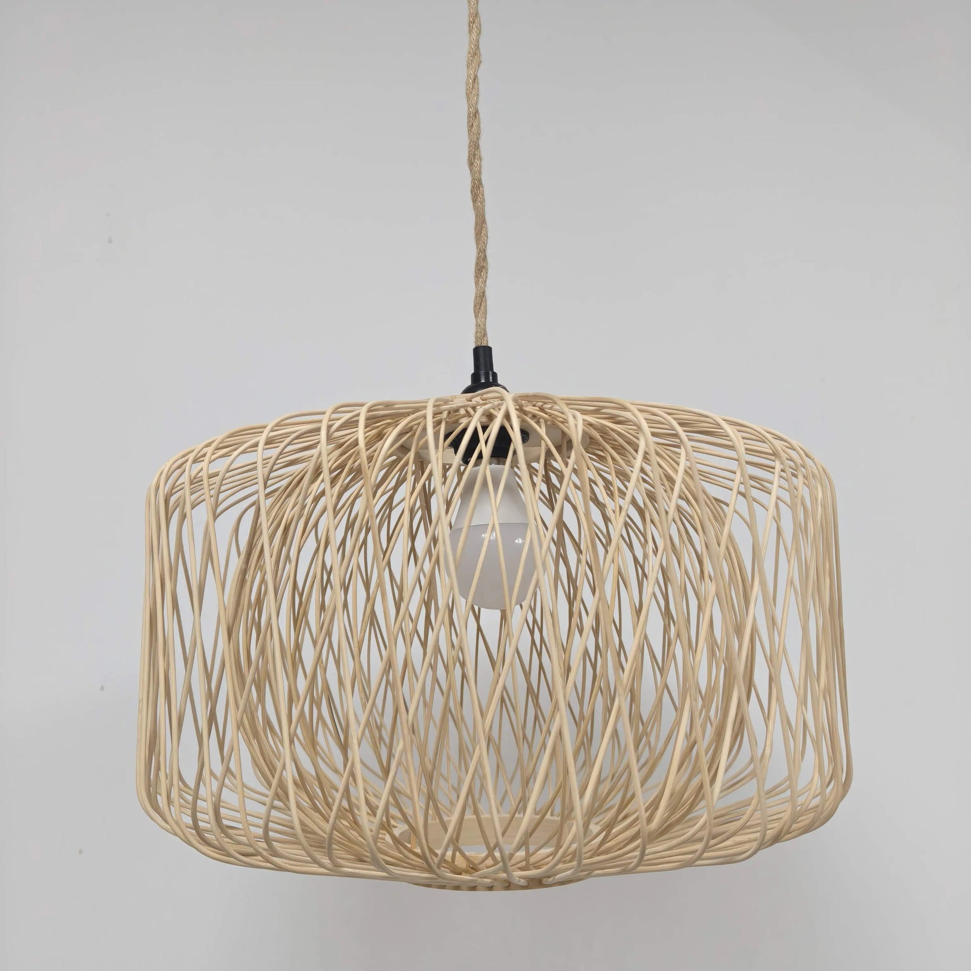Woven by hand using natural bamboo circles and flexible bamboo strips, it creates a sculptural, airy silhouette. When the light turns on, shadows ripple across the room — soft, calming, and organic. It’s the kind of glow that makes you want to stay longer, breathe deeper.