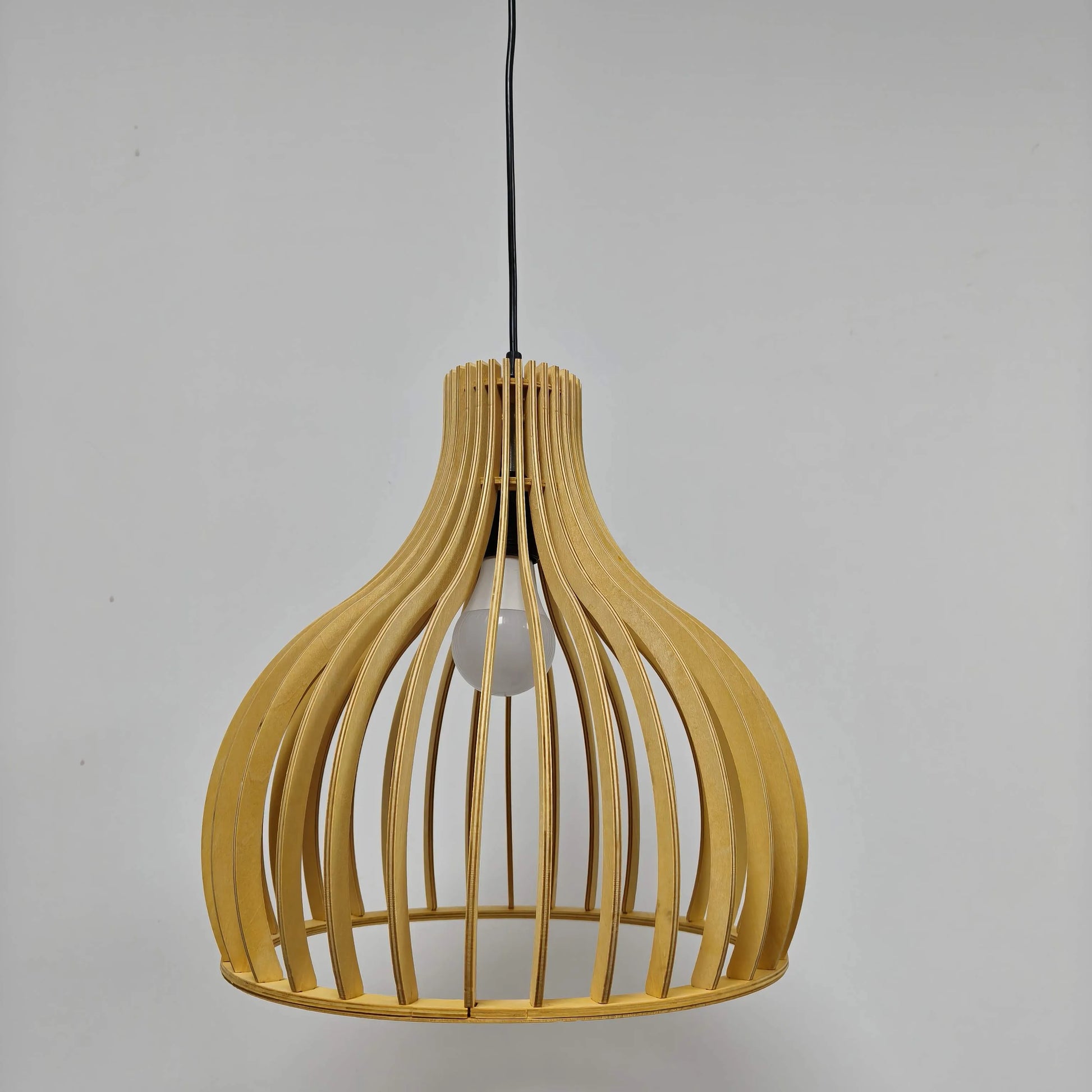 Inspired by octagonal forms and traditional birdcage silhouettes, its open wood structure lets light breathe—soft, calm, and quietly architectural. When switched on, it feels less like a fixture and more like a sculptural presence suspended in air.